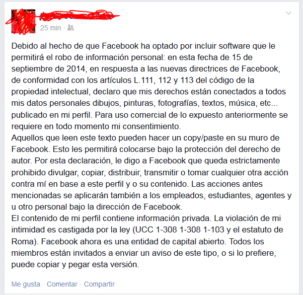 Dejo establecido que debido al hecho de que Facebook ha optado por incluir software que le permitirá el robo de información personal: hoy, 22 de Febrero de 2016, en respuesta a las nuevas directrices de Facebook, de conformidad con los artículos L.111, 112 y 113 del código de la propiedad intelectual, declaro que mis derechos están conectados a todos mis datos personales dibujos, pinturas, fotografías, textos, música, etc... publicado en mi perfil.Para uso comercial de lo expuesto anteriormente se requiere en todo momento mi consentimiento.Aquellos que leen este texto pueden hacer un copy/ paste en su muro de Facebook. Esto les permitirá colocarse bajo la protección del derecho de autor.Por esta declaración, le digo a Facebook que queda estrictamente prohibido divulgar, copiar, distribuir, transmitir o tomar cualquier otra acción contra mí en base a este perfil y o su contenido. Las acciones antes mencionadas se aplicarán también a los empleados, estudiantes, agentes y/o cualquier otro personal bajo la dirección de Facebook.El contenido de mi perfil contiene información privada. La violación de mi intimidad es castigada por la ley (UCC 1-308 1-308 1-103 y el estatuto de Roma).Facebook ahora es una entidad de capital abierto. Todos los miembros están invitados a enviar un aviso de este tipo, o si lo prefieren, pueden copiar y pegar esta versión.Nota: Si no has publicado esta declaración al menos una vez, tácitamente permites el uso de elementos tales como tus fotos, así como la información contenida en la actualización del perfil.