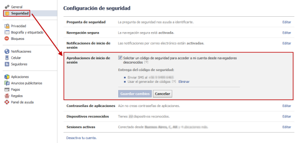La "Aprobación de inicio de sesión" activa una segunda fase de seguridad. Si está operativa, uno solo puede entrar desde smartphones o computadoras no registrados anteriormente colocando otro código de seguridad más, que se envía por SMS a un teléfono o a la app de Facebook.